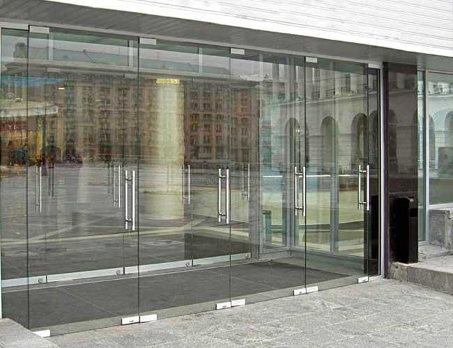 Противопожарная безрамная дверь со стеклом в торговый центр в Сочи